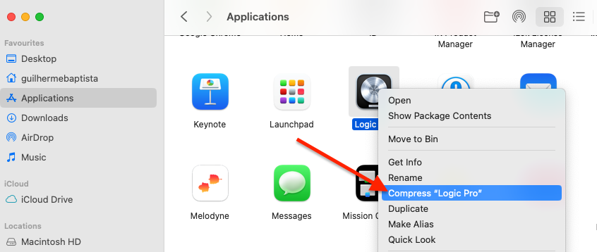 3. Right click on the Logic icon and select “Compress Logic Pro”