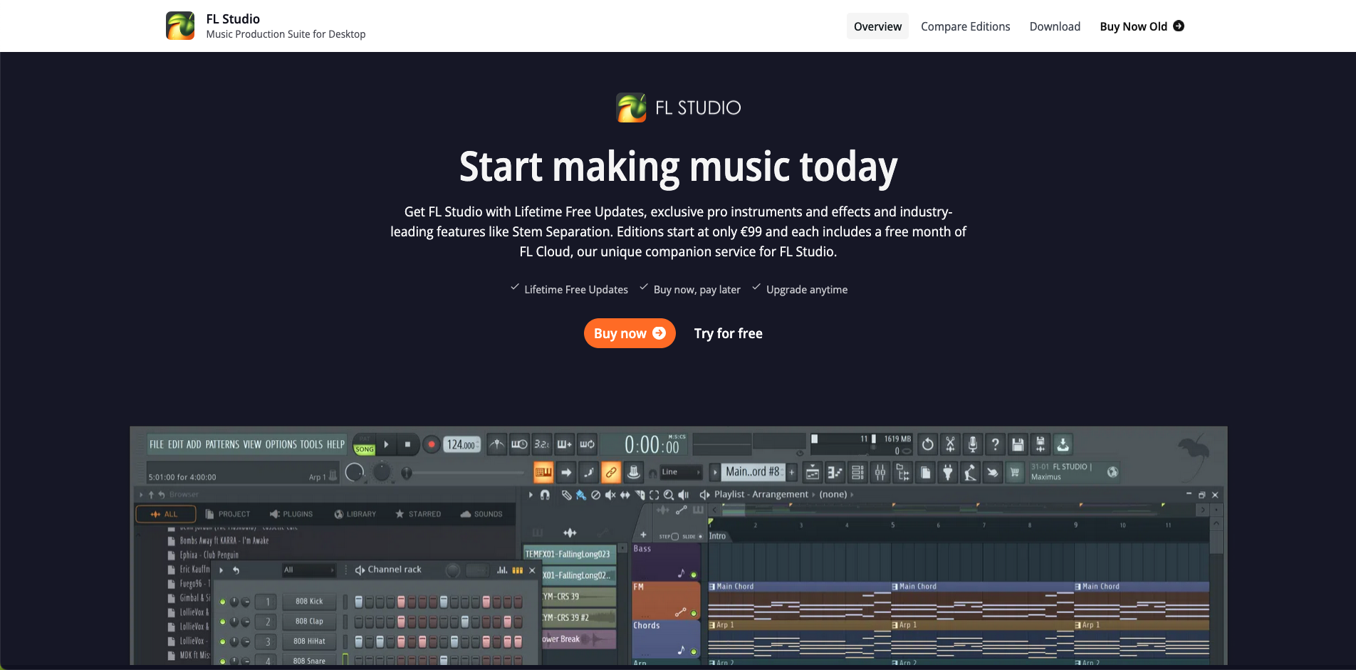 Fruity Edition: 99$/99⏠- Lifetime FL Studio license + 84 instruments and effects, no audio recording, no stem separation.